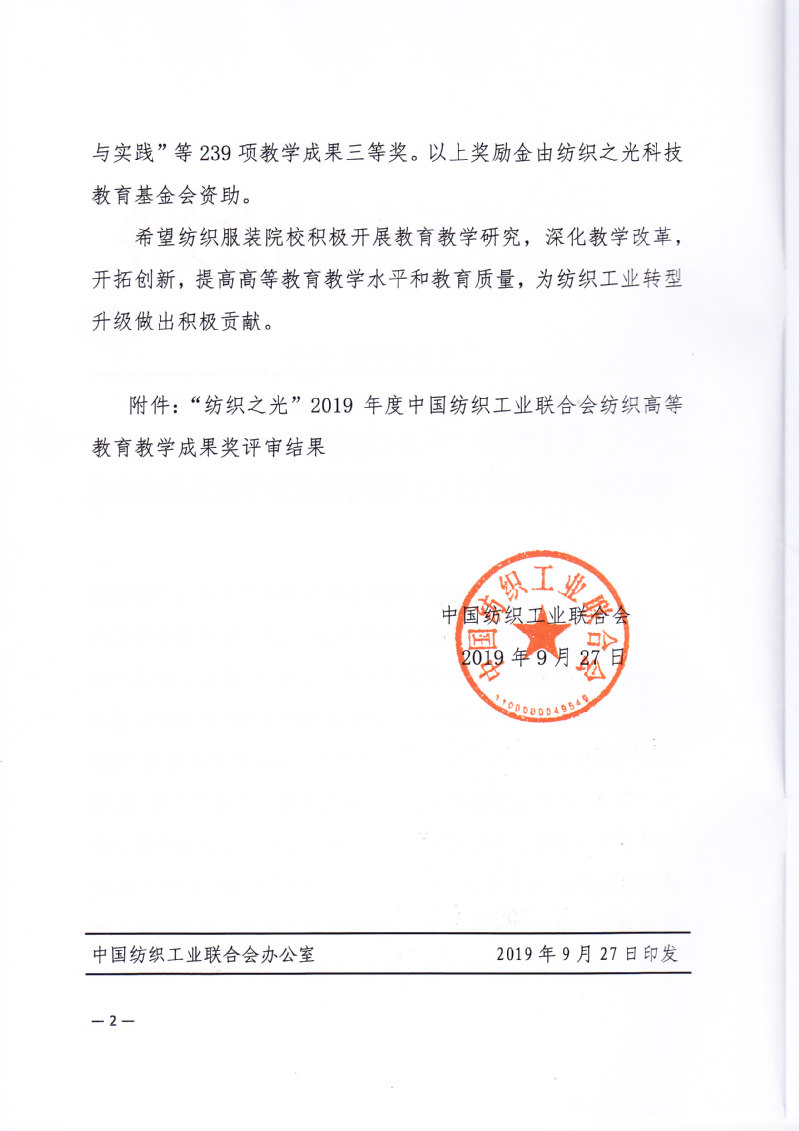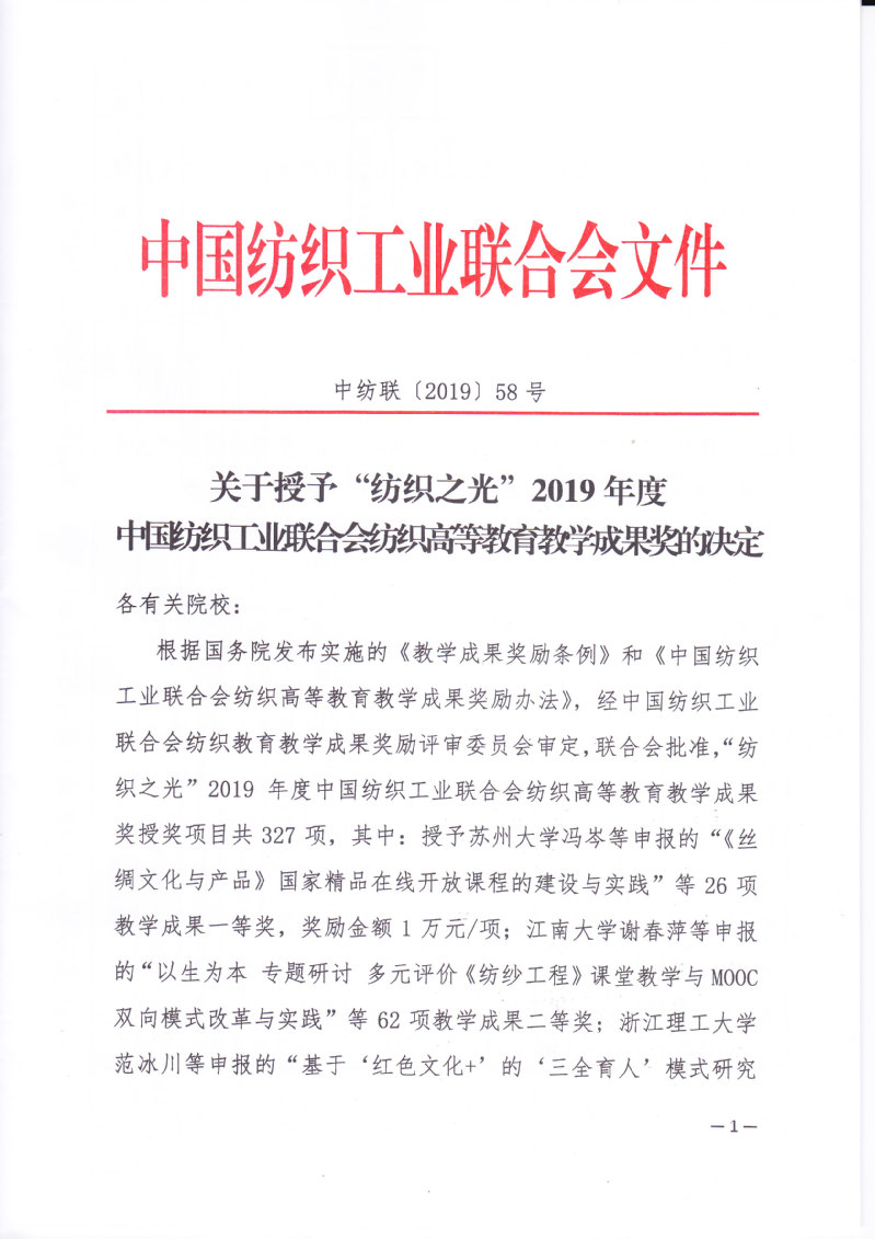 关于授予“纺织之光”2019年度中国纺织工业联合会纺织高等教育教学成果奖的决定