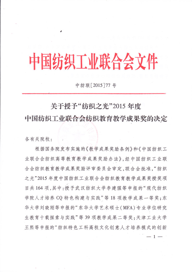 关于授予“纺织之光”2015年度中国纺织工业联合会纺织教育教学成果奖的决定