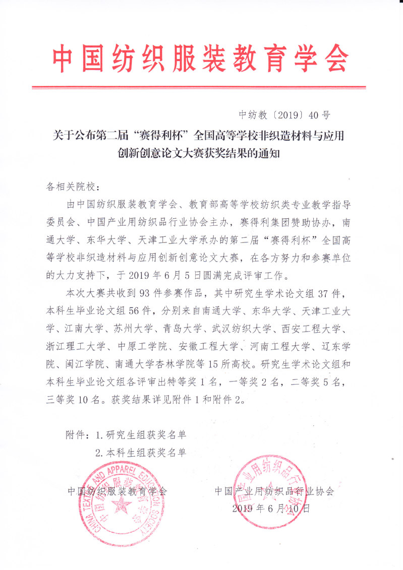 关于公布第二届“赛得利杯”全国高等学校非织造材料与应用创新创意论文大赛获奖结果的通知