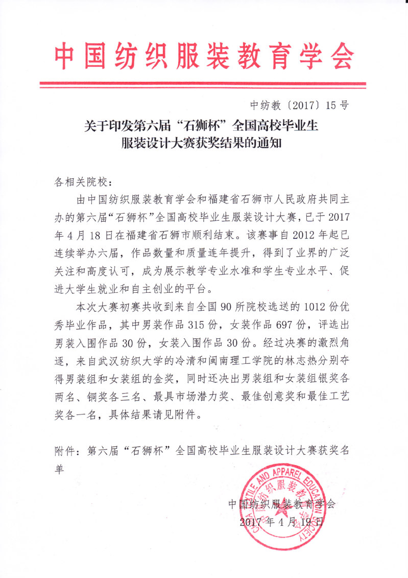 关于印发第六届“石狮杯”全国高校毕业生服装设计大赛获奖结果的通知