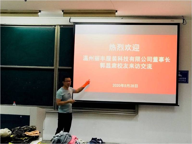 郭显肃创办了温州丽丰服装科技有限公司,此行他带来了自己公司生产的成衣样品。交流之前,轻化工程系主任毛庆辉代表学院对校友重返母校表示热烈欢迎。郭董事长回顾在校学习生活的点点滴滴,表达了对母校和老师的眷念和感激之情。随后,他就成衣染色、染色方法、水洗工艺和创新工艺设计思路四个方面与19级学生进行了亲切的交流,同时他也希望学弟学妹们在学习过程中能发散思维。最后,他表示,愿意用实际行动为母校的发展建言献策,为学弟学妹们提供参观、实习的机会。