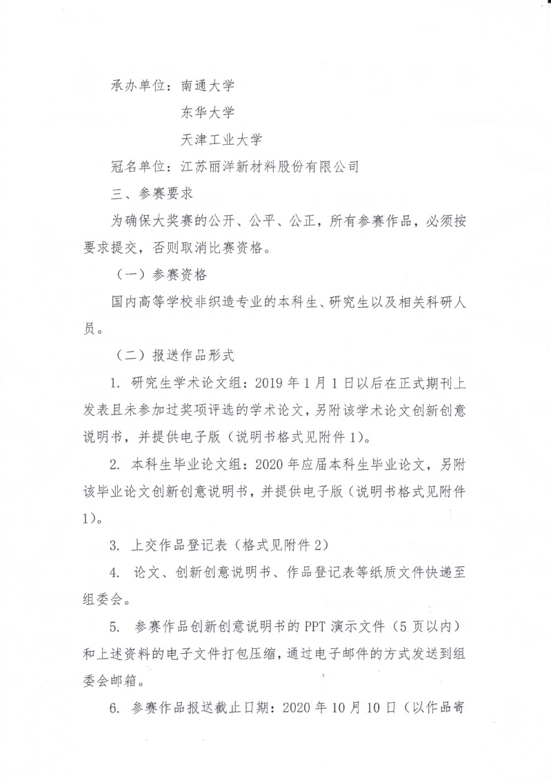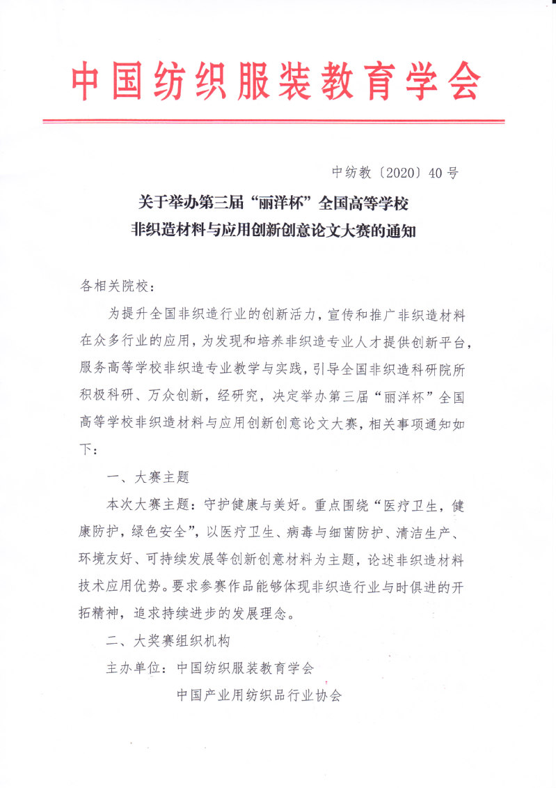 关于举办第三届“丽洋杯”全国高等学校非织造材料与应用创新创意论文大赛的通知