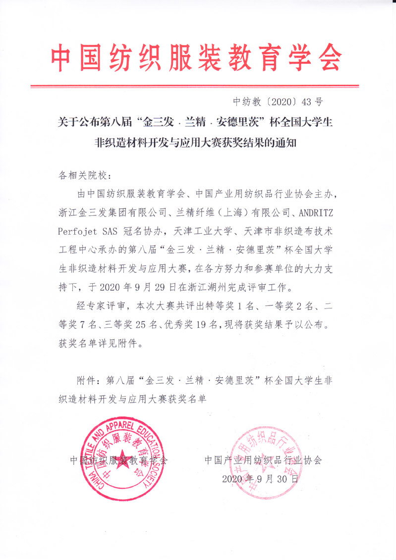 关于公布第八届“金三发﹒兰精﹒安德里茨”杯全国大学生非织造材料开发与应用大赛获奖结果的通知