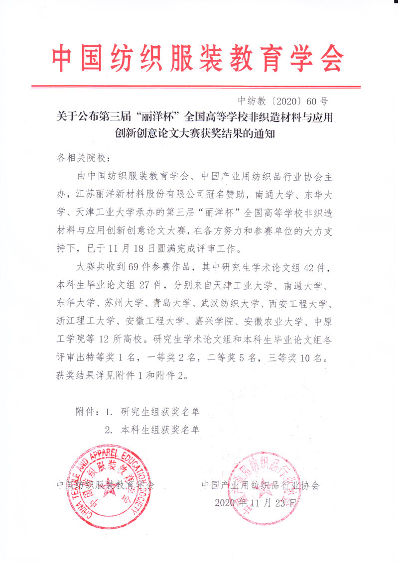 关于公布第三届“丽洋杯”全国高等学校非织造材料与应用创新创意论文大赛获奖结果的通知