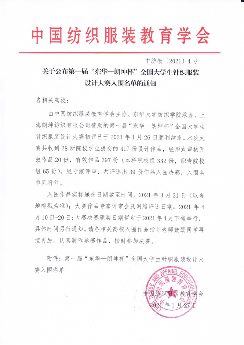 关于公布第一届“东华—朗坤杯”全国大学生针织服装设计大赛入围名单的通知