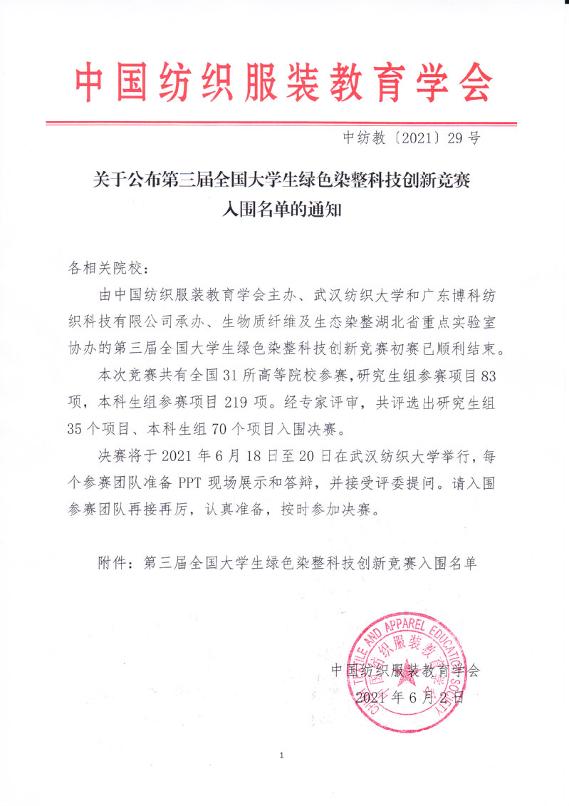 关于公布第三届全国大学生绿色染整科技创新竞赛入围名单的通知