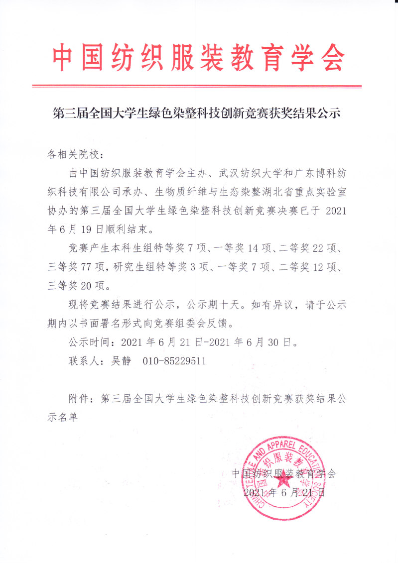 第三届全国大学生绿色染整科技创新竞赛获奖结果公示