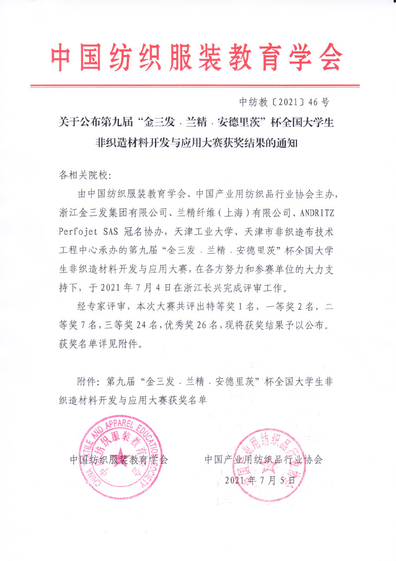 关于公布第九届“金三发﹒兰精﹒安德里茨”杯全国大学生非织造材料开发与应用大赛获奖结果的通知