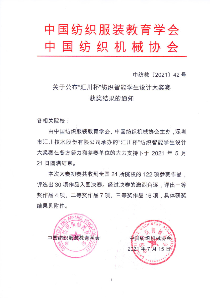 关于公布“汇川杯”纺织智能学生设计大奖赛获奖结果的通知