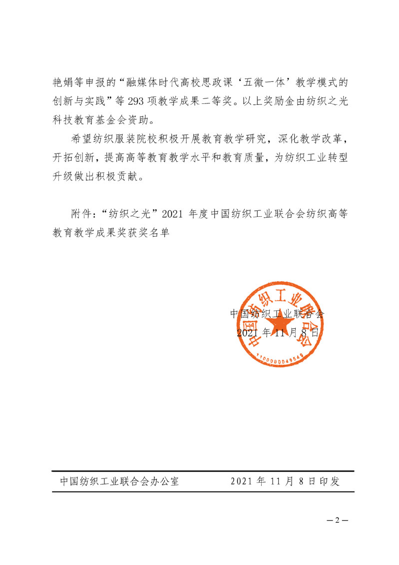 关于授予“纺织之光”2021年度中国纺织工业联合会纺织高等教育教学成果奖的决定