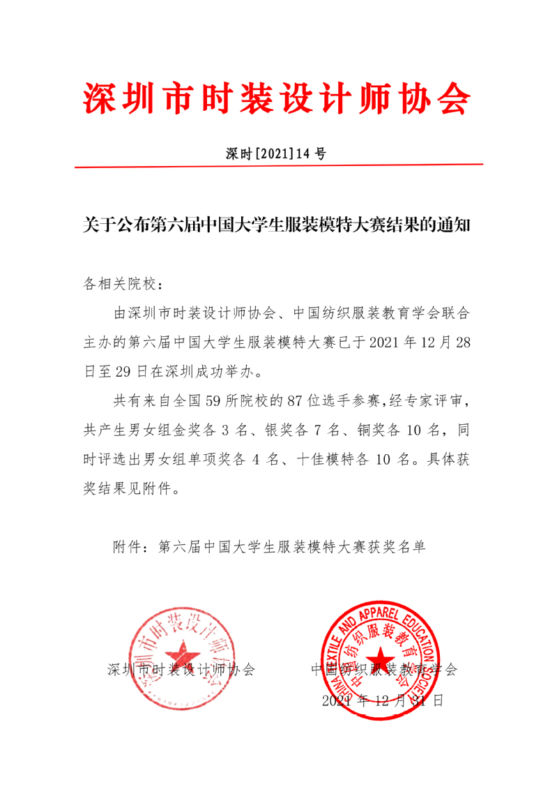 关于公布第六届中国大学生服装模特大赛结果的通知