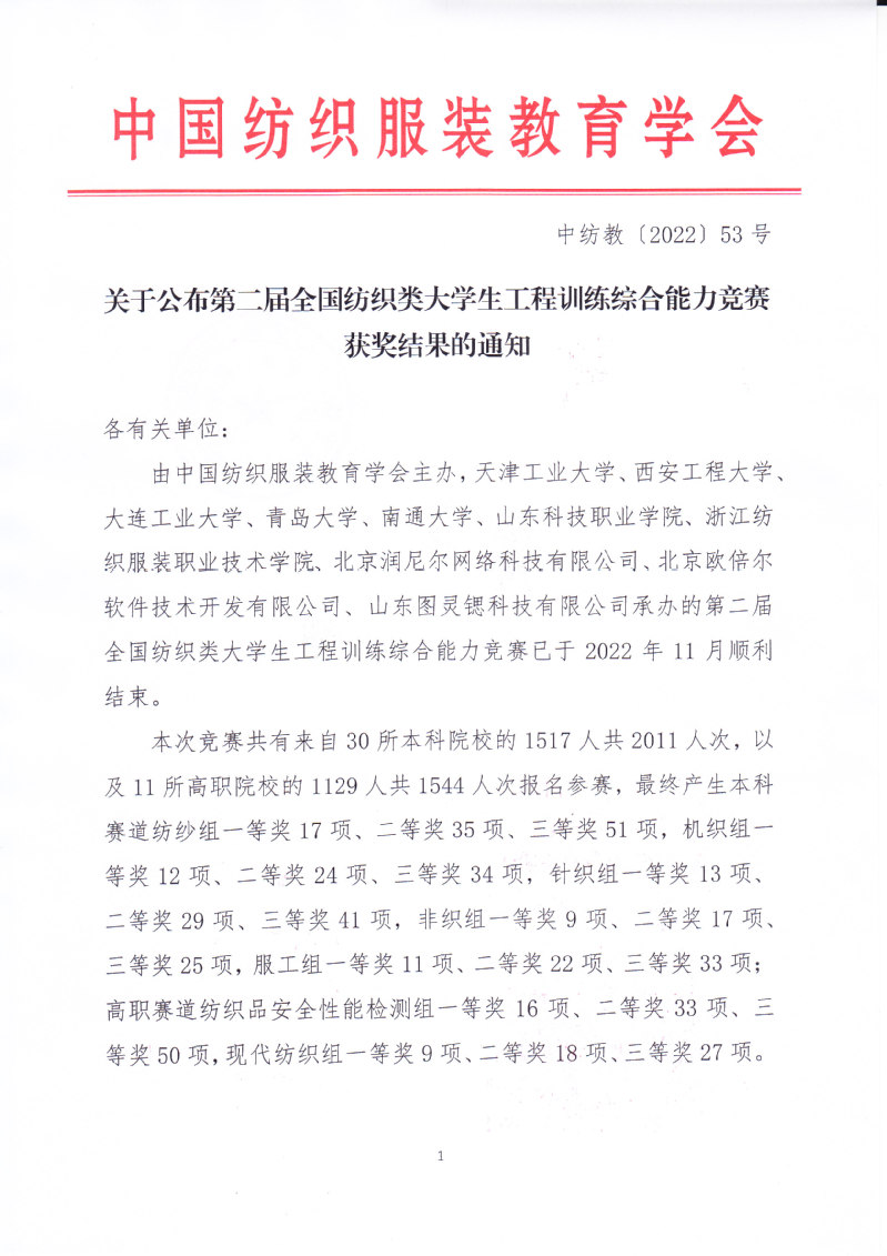 关于公布第二届全国纺织类大学生工程训练综合能力竞赛获奖结果的通知