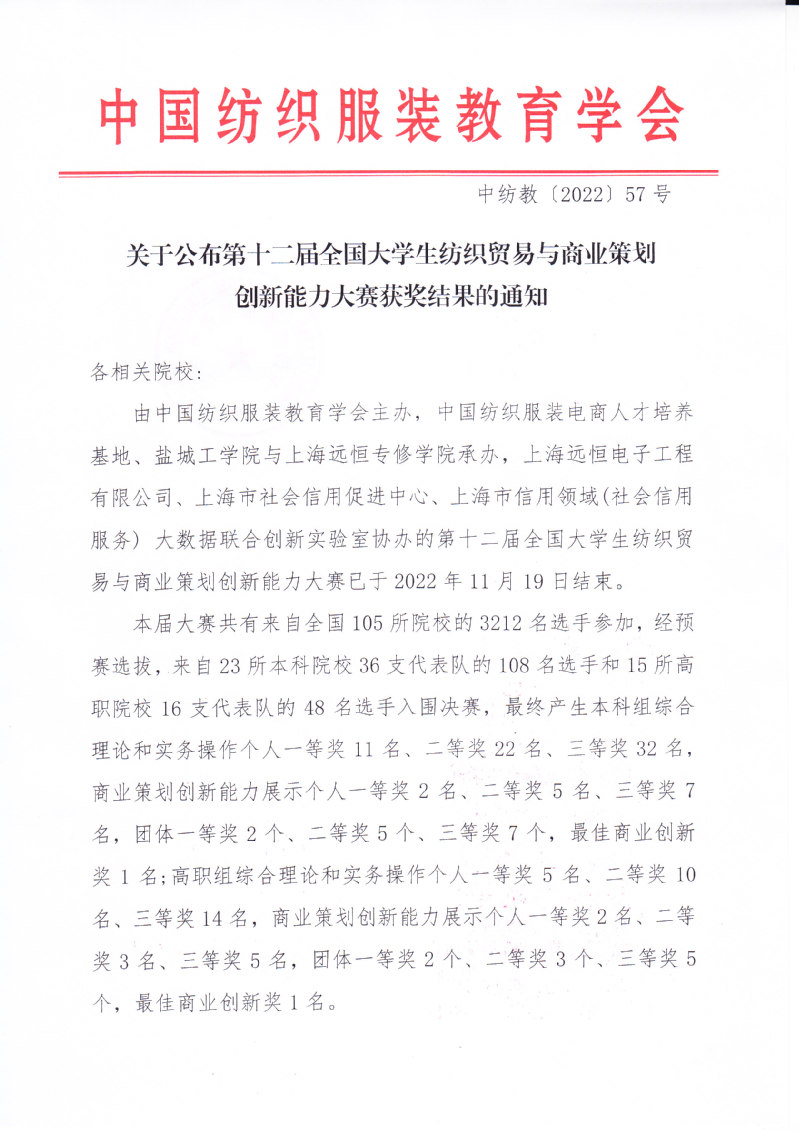 关于公布第十二届全国大学生纺织贸易与商业策划创新能力大赛获奖结果的通知