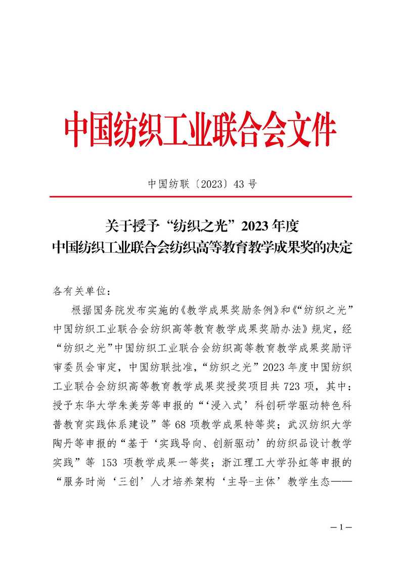 关于授予“纺织之光”2023年度中国纺织工业联合会纺织高等教育教学成果奖的决定