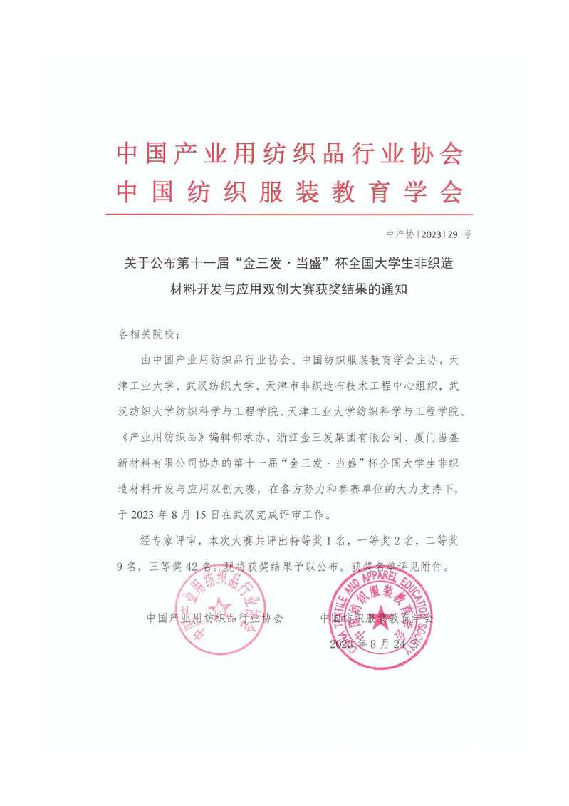 关于公布第十一届“金三发﹒当盛”杯全国大学生非织造材料开发与应用双创大赛获奖结果的通知