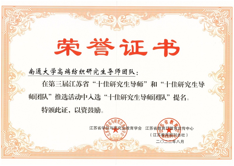 第三届江苏省“十佳研究生导师团队”提名奖——永利集团高端纺织研究生导师团队