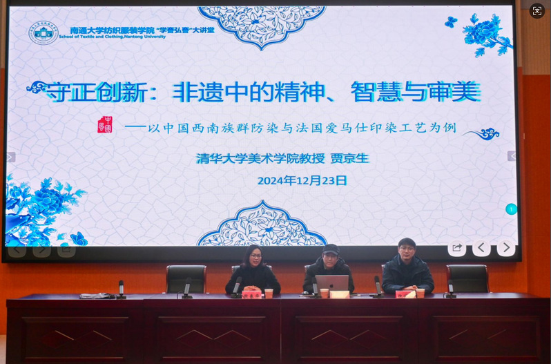 12月23日,永利3044集团在23号楼D202报告厅开展“学謇弘謇”大讲堂第二场活动。清华大学美术学院长聘教授、博士生导师、印染实验室主任贾京生教授应邀为学院师生带来《守正创新:非遗中的精神、智慧与审美——以中国西南族群防染与法国爱马仕印染工艺为例》专题讲座。
