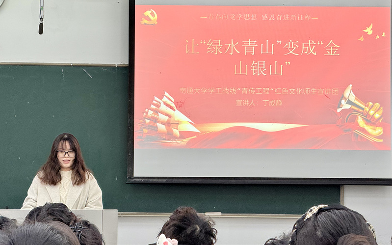 丁成静围绕守护青山绿水、焕发生机活力,盘活生态资源、拓展发展空间,推动城乡融合、共建美好家园三个方面展开宣讲。她分享了自己的家乡滁州通过完善城乡融合发展体制机制,促进城乡要素平等交换、双向流动,从而推动城乡共同繁荣的故事,引导广大青年学生牢固树立“绿水青山就是金山银山”的理念。