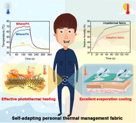 该研究针对复杂和动态的户外环境中单一衣物难以维持适宜体温的挑战,开发了一种由电纺聚酰胺(PA)和一层PPy@MXene涂层组成的不对称面料,并融入了剪纸技术。PA面料具有吸湿膨胀性,使面料对湿度变化具有高灵敏度,作为湿度响应的执行器;PPy@MXene涂层具有高效的光热转换性能,在一个太阳辐射下可使面料温度提升44℃;通过剪纸技术设计,可使该面料在弱光照下通过太阳能进行加热,在汗液产生后自动打开通道释放热量降温。该面料通过协同调节太阳能和汗液蒸发能量,实现高效的动态热管理;相较于传统静态面料,该智能面料展现出优越的环境自适应性。该研究得到了国家自然科学基金和国家重点研发计划项目支持。