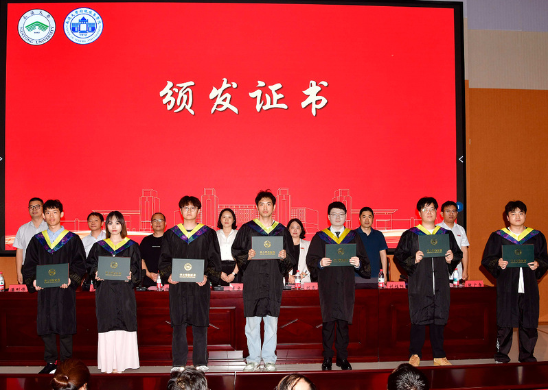 与会领导共同为毕业生代表颁发毕业证书和学位证书。