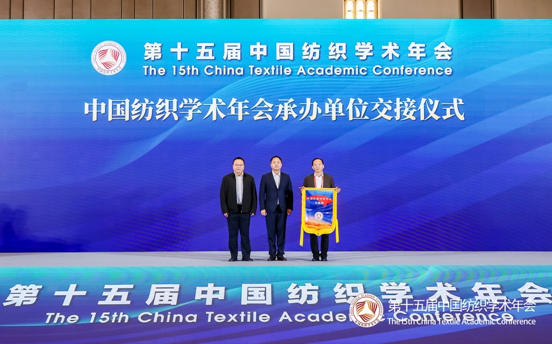主会场最后进行了中国纺织学术年会承办单位交接仪式。伏广伟从第十五届中国纺织学术年会承办单位永利集团副校长华亮手中接过年会旗,转交给第十六届中国纺织学术年会承办单位武汉纺织大学副校长冯军。