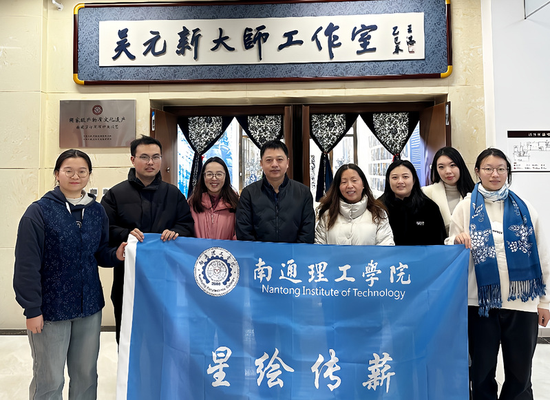 南通理工学院一行首先参观了我院吴元新大师工作室。参观过程中,“青出于蓝”学生创新创业团队现场介绍了蓝印花布的发展历程与创新成果,并与来访人员就非遗项目的现代转化、文创产品开发及市场推广等话题展开热烈交流。同学们扎实的非遗理论知识和富有创意的现代设计理念,得到了南通理工学院同仁的高度赞赏。
